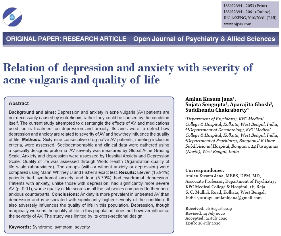 “Relation of depression and anxiety with severity of acne vulgaris and quality of life” by Amlan Kusum Jana, Sujata Sengupta, Aparajita Ghosh, and Suddhendu Chakraborty is the new Advance Online Publication (AOP) of the Open Journal of Psychiatry & Allied Sciences (OJPAS®).