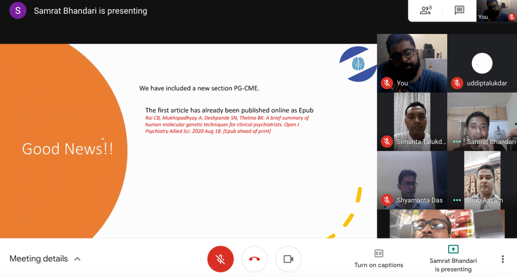 The editorial board members of the Open Journal of Psychiatry & Allied Sciences (OJPAS®) met in a webinar along with the proprietor of Academy Publisher and discussed the inclusion of the journal in ResearchGate (RG) and assignment of RG Journal Impact (0.34) that is comparable to the Asian Journal of Psychiatry (0.64), the Indian Journal of Psychiatry (0.50), and the Indian Journal of Psychological Medicine (0.47). OJPAS® is under evaluation by Clarivate Analytics for inclusion in the Emerging Sources Citation Index (ESCI) of Web of Science. Dr. Shijo John Joseph has joined as section editor for manuscripts related to the coronavirus disease 2019 (COVID-19). New section on continuing medical education (CME) has started and first article has already been published (A brief summary of human molecular genetic techniques for clinical psychiatrists). Next in the section will be on ‘Statistics for clinical research: basic to advance’. Peer-review platform is not working as needed and decided upon to develop one. All the editors need to understand the conflict of interest for editors. For advance online publication, digital object identifier (DOI) will be applied directly to Crossref. Instructions for authors and guidelines for reviewers are deliberated.