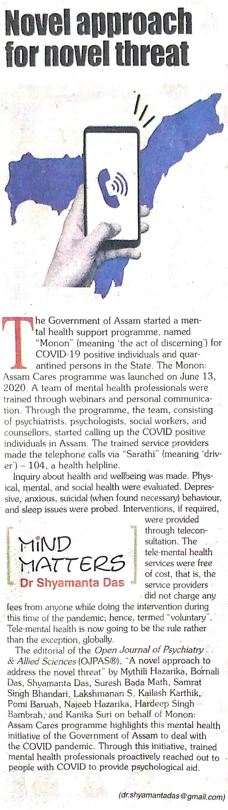This fortnight’s Mind Matters column of the Editor-in-Chief of the Open Journal of Psychiatry & Allied Sciences (OJPAS®), Shyamanta Das, titled “Novel approach for novel threat” in Horizon, the Friday supplement with The Assam Tribune focuses on the Editorial, “A novel approach to address the novel threat” by Mythili Hazarika, Bornali Das, Shyamanta Das, Suresh Bada Math, Samrat Singh Bhandari, Lakshmanan S, Kailash Karthik, Pomi Baruah, Najeeb Hazarika, Hardeep Singh Bambrah, Kanika Suri; the Monon: Assam Cares programme, and published in the January-June 2021, Volume 12 Issue 1 of OJPAS®.