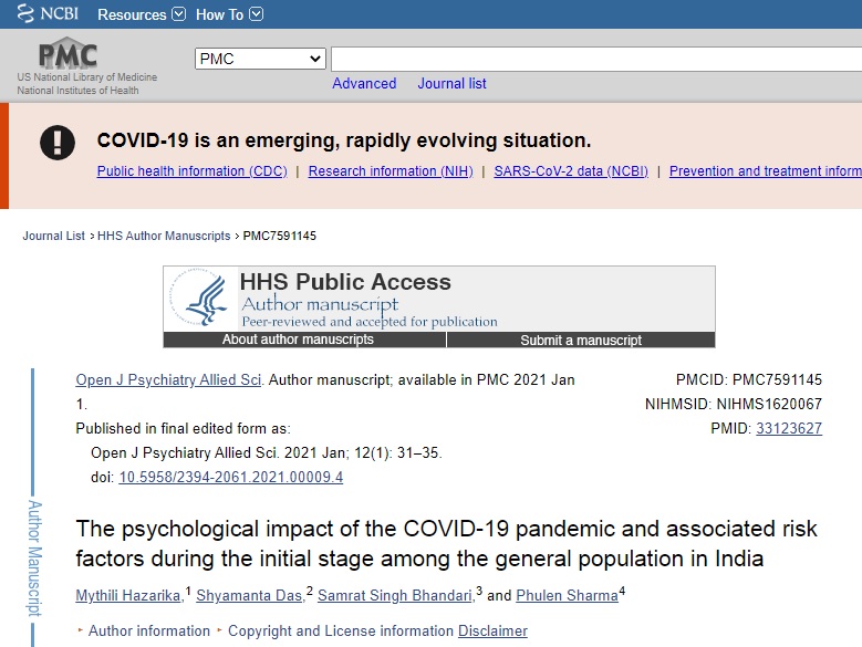 “The psychological impact of the COVID-19 pandemic and associated risk factors during the initial stage among the general population in India” by Mythili Hazarika, Shyamanta Das, Samrat Singh Bhandari, and Phulen Sharma, and published in the January-June 2021, Volume 12 Issue 1 of the Open Journal of Psychiatry & Allied Sciences (OJPAS®) is in PubMed Central (PMCID: PMC7591145).