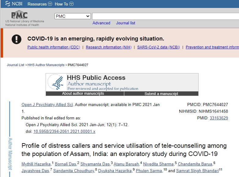 “Profile of distress callers and service utilisation of tele-counselling among the population of Assam, India: an exploratory study during COVID-19” by Mythili Hazarika, Bornali Das, Shyamanta Das, Atanu Baruah, Nivedita Sharma, Chandamita Barua, Jayashree Das, Sandamita Choudhury, Dyuksha Hazarika, Phulen Sarma, and Samrat Singh Bhandari, and published in the January-June 2021, Volume 12 Issue 1 of the Open Journal of Psychiatry & Allied Sciences (OJPAS®) is in PubMed Central (PMCID: PMC7644027).