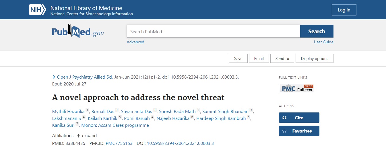 “A novel approach to address the novel threat” by Mythili Hazarika, Bornali Das, Shyamanta Das, Suresh Bada Math, Samrat Singh Bhandari, Lakshmanan S, Kailash Karthik, Pomi Baruah, Najeeb Hazarika, Hardeep Singh Bambrah, Kanika Suri; the Monon: Assam Cares programme and published in the January-June 2021, Volume 12 Issue 1 of the Open Journal of Psychiatry & Allied Sciences (OJPAS®) is in PubMed (PMID: 33364435).