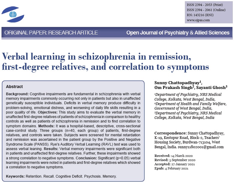 “Verbal learning in schizophrenia in remission, first-degree relatives, and correlation to symptoms” by Sunny Chattopadhyay, Om Prakash Singh, and Sayanti Ghosh is the new Advance Online Publication of the Open Journal of Psychiatry & Allied Sciences (OJPAS®).