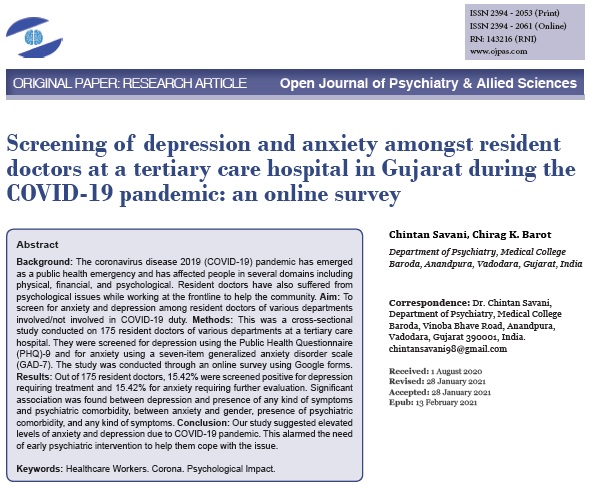 “Screening of depression and anxiety amongst resident doctors at a tertiary care hospital in Gujarat during the COVID-19 pandemic: an online survey” by Chintan Savani and Chirag K. Barot is the new Advance Online Publication of the Open Journal of Psychiatry & Allied Sciences (OJPAS®).