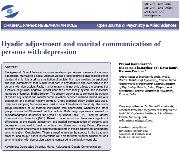 “Dyadic adjustment and marital communication of persons with depression” by Prasad Kannekanti, Dipanjan Bhattacharjee, Daya Ram, and Hariom Pachori is the new Advance Online Publication of the Open Journal of Psychiatry & Allied Sciences (OJPAS®).