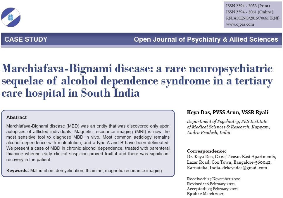 “Marchiafava-Bignami disease: a rare neuropsychiatric sequelae of alcohol dependence syndrome in a tertiary care hospital in South India” by Keya Das, PVSS Arun, and VSSR Ryali is the new Advance Online Publication (AOP) of the Open Journal of Psychiatry & Allied Sciences (OJPAS®).