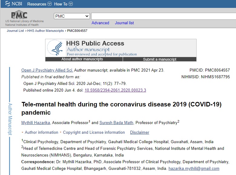 “Tele-mental health during the coronavirus disease 2019 (COVID-19) pandemic” by Mythili Hazarika and Suresh Bada Math, and published in the July-December 2020, Volume 11 Issue 2 of the Open Journal of Psychiatry & Allied Sciences (OJPAS®) is in PubMed Central (PMCID: PMC8064557).