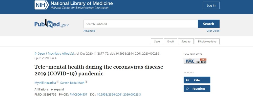 “Tele-mental health during the coronavirus disease 2019 (COVID-19) pandemic” by Mythili Hazarika and Suresh Bada Math, and published in the July-December 2020, Volume 11 Issue 2 of the Open Journal of Psychiatry & Allied Sciences (OJPAS®) is in PubMed (PMID: 33898755).