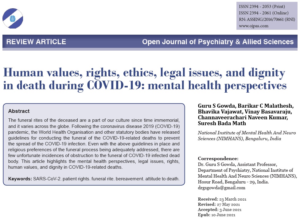 “Human values, rights, ethics, legal issues, and dignity in death during COVID-19: mental health perspectives” by Guru S Gowda, Barikar C Malathesh, Bhavika Vajawat, Vinay Basavaraju, Channaveerachari Naveen Kumar, and Suresh Bada Math is the new Advance Online Publication (AOP) of the Open Journal of Psychiatry & Allied Sciences (OJPAS®).