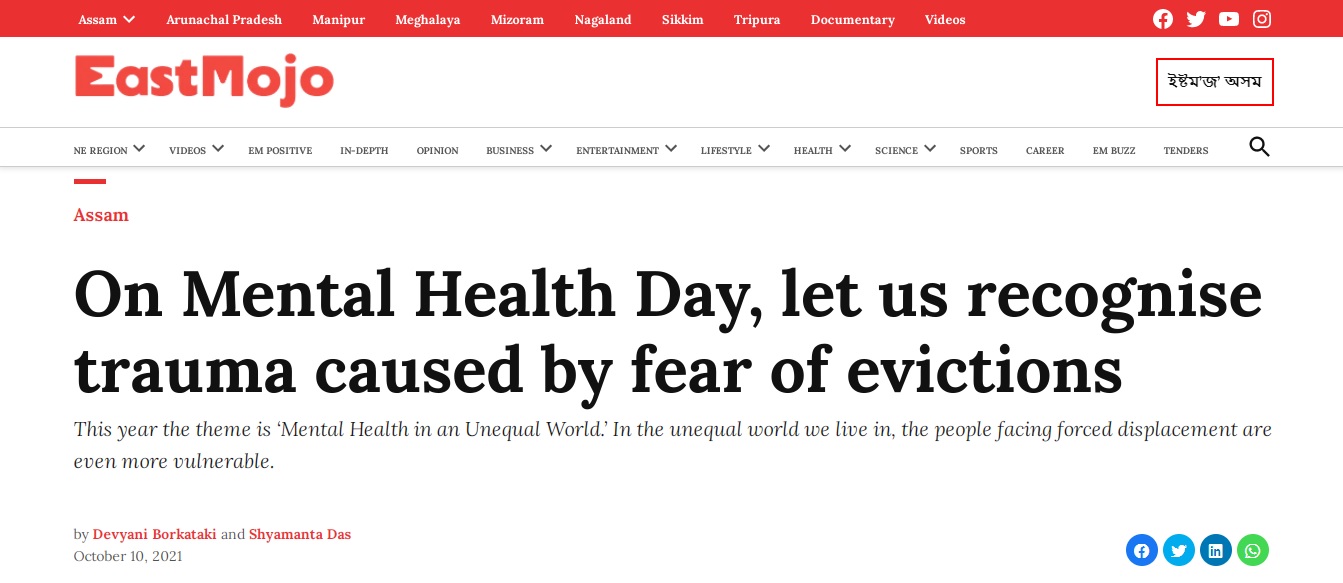 ‘On Mental Health Day, let us recognise trauma caused by fear of evictions’ by Devyani Borkataki and Shyamanta Das, the Editor-in-Chief of the Open Journal of Psychiatry & Allied Sciences (OJPAS®) is in EastMojo: “This year the theme is ‘Mental Health in an Unequal World.’ In the unequal world we live in, the people facing forced displacement are even more vulnerable.”