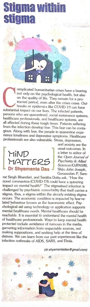 Shyamanta Das, the Editor-in-Chief of the Open Journal of Psychiatry & Allied Sciences (OJPAS®) in the fortnightly Mind Matters column, titled ‘Stigma within stigma’ in Horizon, the Friday supplement with The Assam Tribune discusses the letter to editor, “How the novel coronavirus (COVID-19) could have a quivering impact on mental health?” by Shijo John Joseph, Gunaseelan P, Samrat Singh Bhandari, and Sanjiba Dutta, and published in July-December 2020, Volume 11 Issue 2 of OJPAS®.