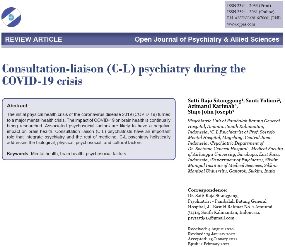 “Consultation-liaison (C-L) psychiatry during the COVID-19 crisis” by Satti Raja Sitanggang, Santi Yuliani, Azimatul Karimah, and Shijo John Joseph is the new Advance Online Publication (AOP) of the Open Journal of Psychiatry & Allied Sciences (OJPAS®).