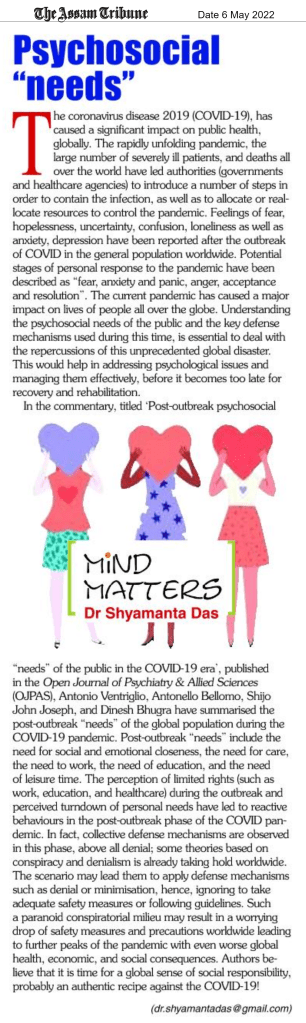 In the fortnightly Mind Matters column, titled ‘Psychosocial “needs”’ of Shyamanta Das, the Editor-in-Chief of the Open Journal of Psychiatry & Allied Sciences (OJPAS®) in Horizon, the Friday supplement with The Assam Tribune, the commentary, ‘Post-outbreak psychosocial “needs” of the public in the COVID-19 era’ by Antonio Ventriglio, Antonello Bellomo, Shijo John Joseph, and Dinesh Bhugra is highlighted that is published in the January-June 2021, Volume 12 Issue 1 of OJPAS®.