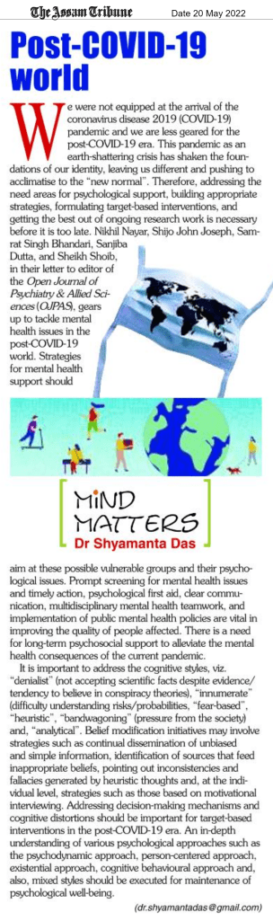 The Editor-in-Chief of the Open Journal of Psychiatry & Allied Sciences (OJPAS®), Shyamanta Das in the fortnightly Mind Matters column, titled “Post-COVID-19 world” of Horizon, the Friday supplement with The Assam Tribune, has highlighted the letter to editor, “Gearing up to tackle mental health issues in the post-COVID-19 world” by Nikhil Nayar, Shijo John Joseph, Samrat Singh Bhandari, Sanjiba Dutta, and Sheikh Shoib, and published in the January-June 2021, Volume 12 Issue 1 of OJPAS®.