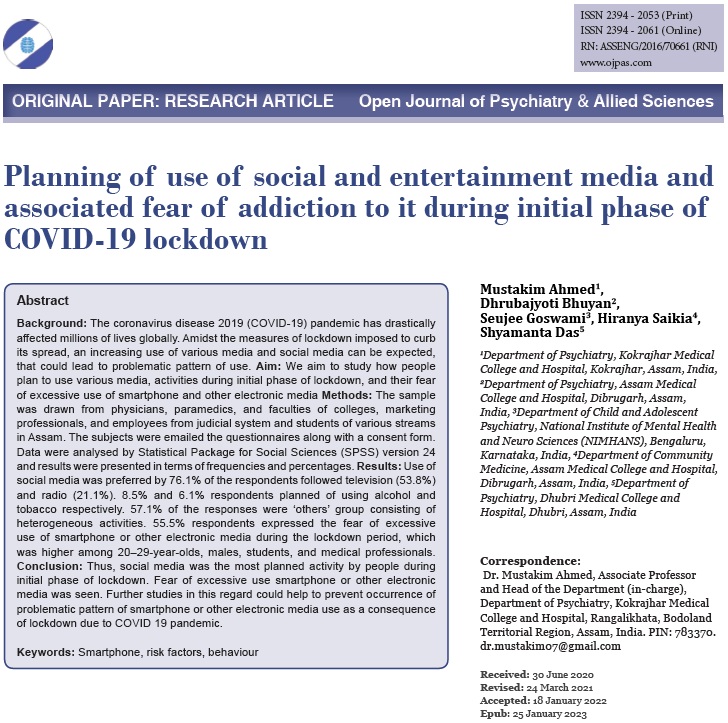 “Planning of use of social and entertainment media and associated fear of addiction to it during initial phase of COVID-19 lockdown” by Mustakim Ahmed, Dhrubajyoti Bhuyan, Seujee Goswami, Hiranya Saikia, and Shyamanta Das is the new Advance Online Publication (AOP) of the Open Journal of Psychiatry & Allied Sciences (OJPAS®).