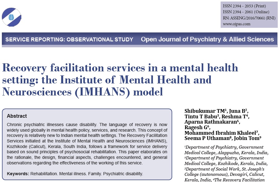 “Recovery facilitation services in a mental health setting: the Institute of Mental Health and Neurosciences (IMHANS) model” by Shibukumar TM, Juna B, Tintu T Babu, Reshma T, Aparna Rathnakaran, Ragesh G, Mohammed Ibrahim Khaleel, Seema P Uthaman, and Jobin Tom is the new Advance Online Publication of the Open Journal of Psychiatry & Allied Sciences (OJPAS®).