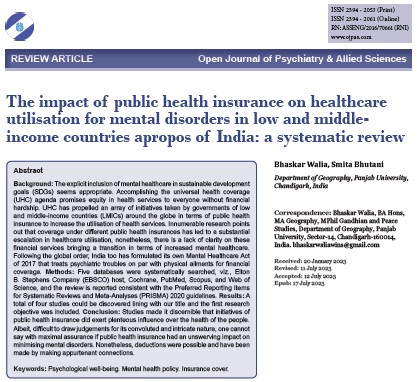 “The impact of public health insurance on healthcare utilisation for mental disorders in low and middle-income countries apropos of India: a systematic review” by Bhaskar Walia and Smita Bhutani is the new Advance Online Publication of the Open Journal of Psychiatry & Allied Sciences (OJPAS®).