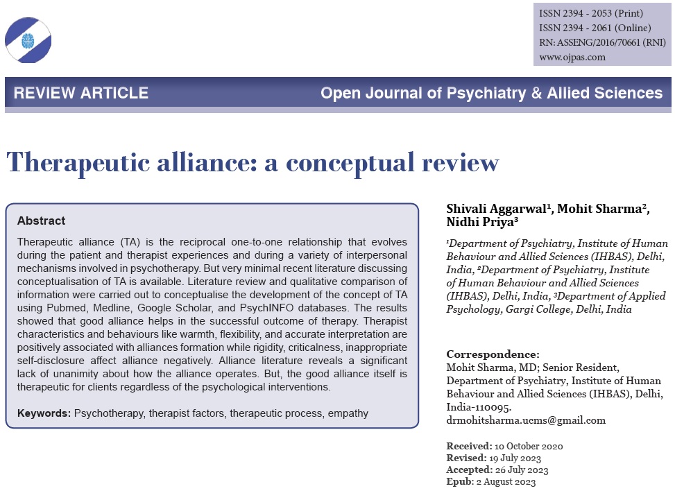 “Therapeutic alliance: a conceptual review” by Shivali Aggarwal, Mohit Sharma, and Nidhi Priya is the new Advance Online Publication (AOP) of the Open Journal of Psychiatry & Allied Sciences (OJPAS®).
