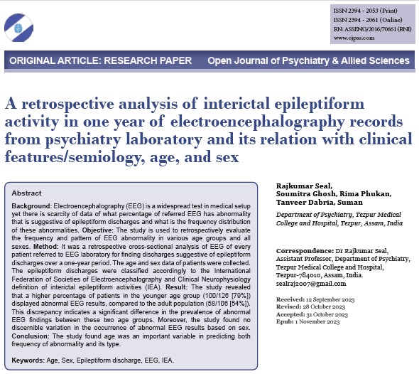 “A retrospective analysis of interictal epileptiform activity in one year of electroencephalography records from psychiatry laboratory and its relation with clinical features/semiology, age, and sex” by Rajkumar Seal, Soumitra Ghosh, Rima Phukan, Tanveer Dabria, and Suman is the new Advance Online Publication (AOP) of the Open Journal of Psychiatry & Allied Sciences (OJPAS®).