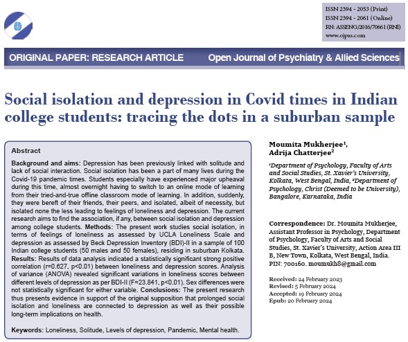 “Social isolation and depression in Covid times in Indian college students: tracing the dots in a suburban sample” by Moumita Mukherjee and Adrija Chatterjee is the new Advance Online Publication of the Open Journal of Psychiatry & Allied Sciences (OJPAS®).