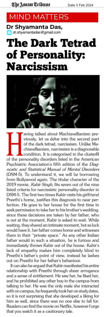 “The dark tetrad of personality: narcissism” is the title of this fortnight’s Mind Matters column of the Editor-in-Chief of the Open Journal of Psychiatry & Allied Sciences (OJPAS®), Shyamanta Das in Horizon, the Monday supplement with The Assam Tribune.