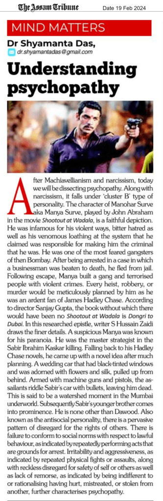 This fortnight’s Mind Matters column of the Editor-in-Chief of the Open Journal of Psychiatry & Allied Sciences (OJPAS®), Shyamanta Das in Horizon, the Monday supplement with The Asam Tribune is titled “Understanding psychopathy.”