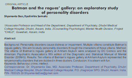 The Editor-in-Chief of the Open Journal of Psychiatry & Allied Sciences (OJPAS®), Shyamanta Das and Dyutimitra Sarmah’s article titled “Batman and the rogues’ gallery: an exploratory study of personality disorders” is published in the Indian Psychiatric Society – Assam State Branch (IPSASB) Mid Year Conference Souvenir released at Dhubri Medical College Hospital, Assam.