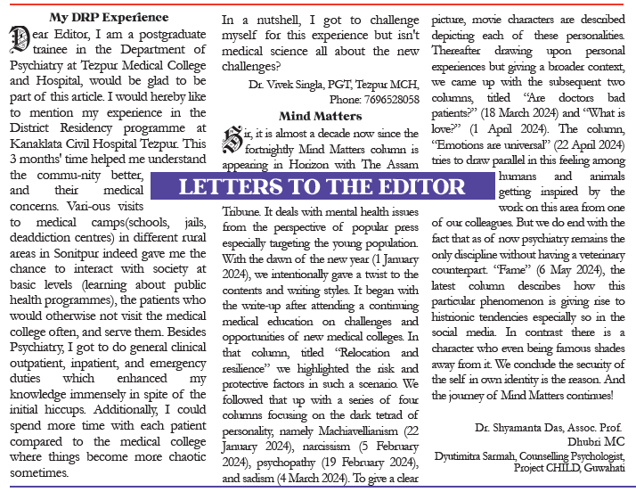 This fortnight’s Mind Matters column in Horizon, the Monday supplement with The Assam Tribune by the Editor-in-Chief of the Open Journal of Psychiatry & Allied Sciences (OJPAS®), Shyamanta Das and Dyutimitra Sarmah is titled, “It takes a village…”