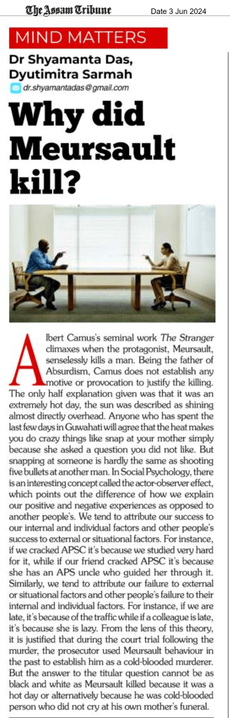 This fortnight’s Mind Matters column in Horizon, the Monday supplement with The Assam Tribune by the Editor-in-Chief of the Open Journal of Psychiatry & Allied Sciences (OJPAS®), Shyamanta Das and Dyutimitra Sarmah is titled, “Why did Meursault kill?”