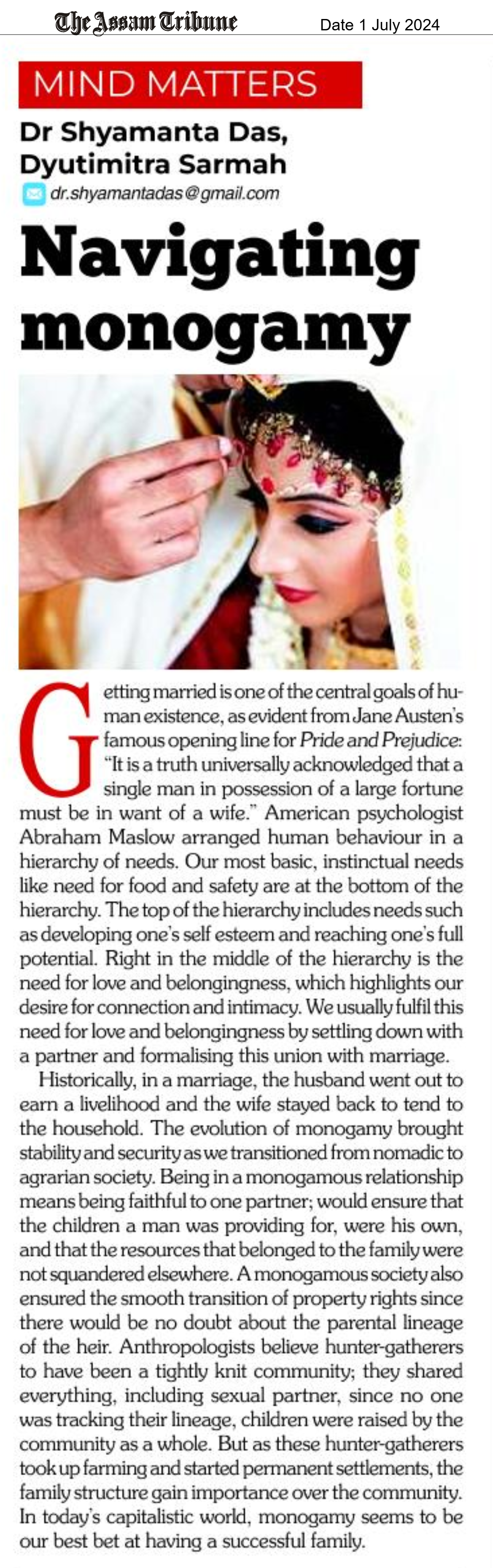 This fortnight’s Mind Matters column in Horizon, the Monday supplement with The Assam Tribune by the Editor-in-Chief of the Open Journal of Psychiatry & Allied Sciences (OJPAS®), Shyamanta Das and Dyutimitra Sarmah is titled, “Navigating monogamy.”