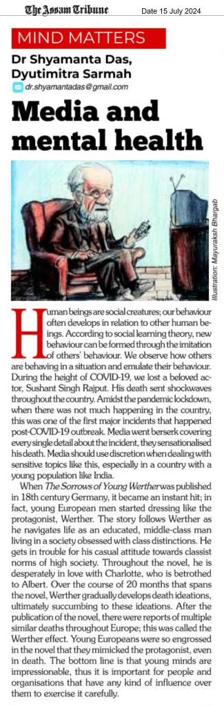 This fortnight’s Mind Matters column in Horizon, the Monday supplement with The Assam Tribune by the Editor-in-Chief of the Open Journal of Psychiatry & Allied Sciences (OJPAS®), Shyamanta Das and Dyutimitra Sarmah is titled, “Media and mental health.”