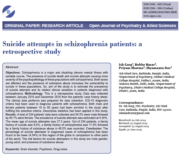 “Suicide attempts in schizophrenia patients: a retrospective study” by Ish Garg, Bobby Hmar, Priyam Sharma, and Shyamanta Das is the new Advance Online Publication (AOP) of the Open Journal of Psychiatry & Allied Sciences (OJPAS®).