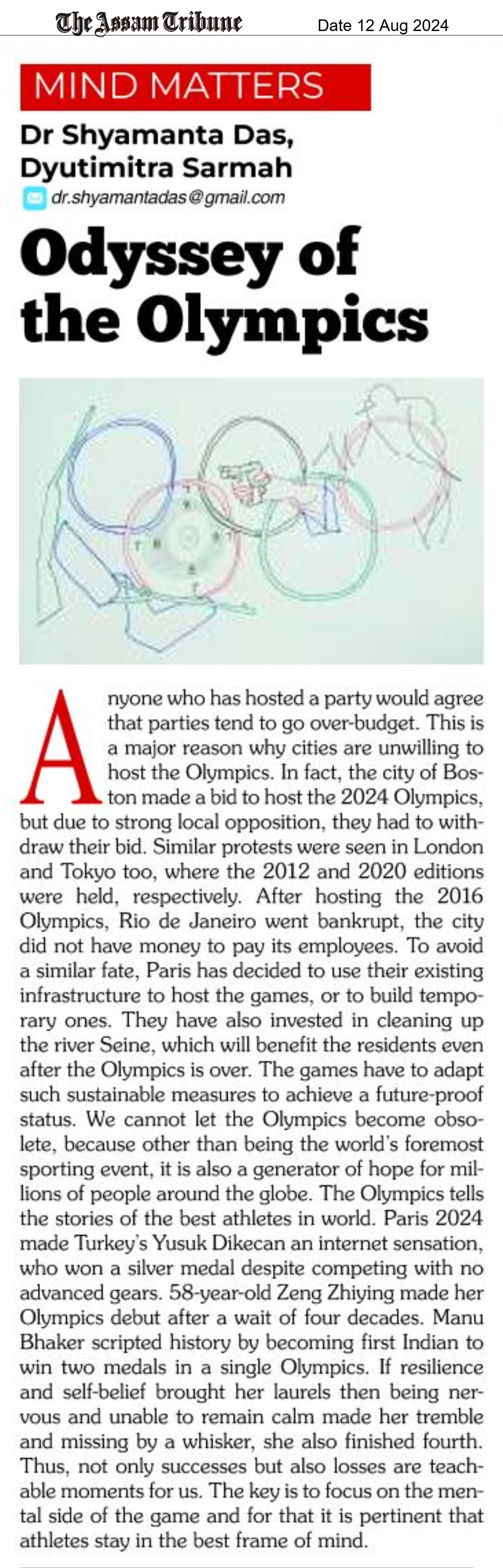 This fortnight’s Mind Matters column in Horizon, the Monday supplement with The Assam Tribune by the Editor-in-Chief of the Open Journal of Psychiatry & Allied Sciences (OJPAS®), Shyamanta Das and Dyutimitra Sarmah is titled, “Odyssey of the Olympics.”
