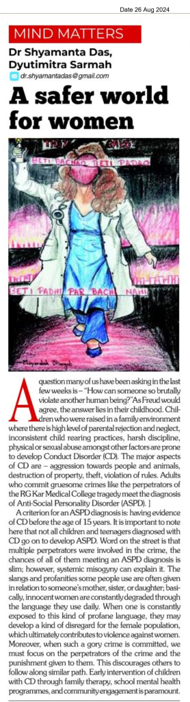 This fortnight’s Mind Matters column in Horizon, the Monday supplement with The Assam Tribune by the Editor-in-Chief of the Open Journal of Psychiatry & Allied Sciences (OJPAS®), Shyamanta Das and Dyutimitra Sarmah is titled, “A safer world for women.”