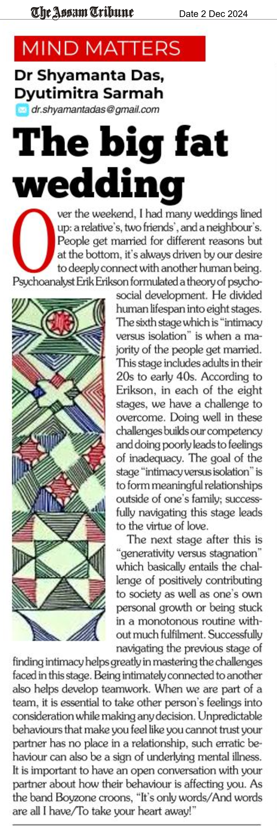 This fortnight’s Mind Matters column in Horizon, the Monday supplement with The Assam Tribune by the Editor-in-Chief of the Open Journal of Psychiatry & Allied Sciences (OJPAS®), Shyamanta Das and Dyutimitra Sarmah is titled, “The big fat wedding.”