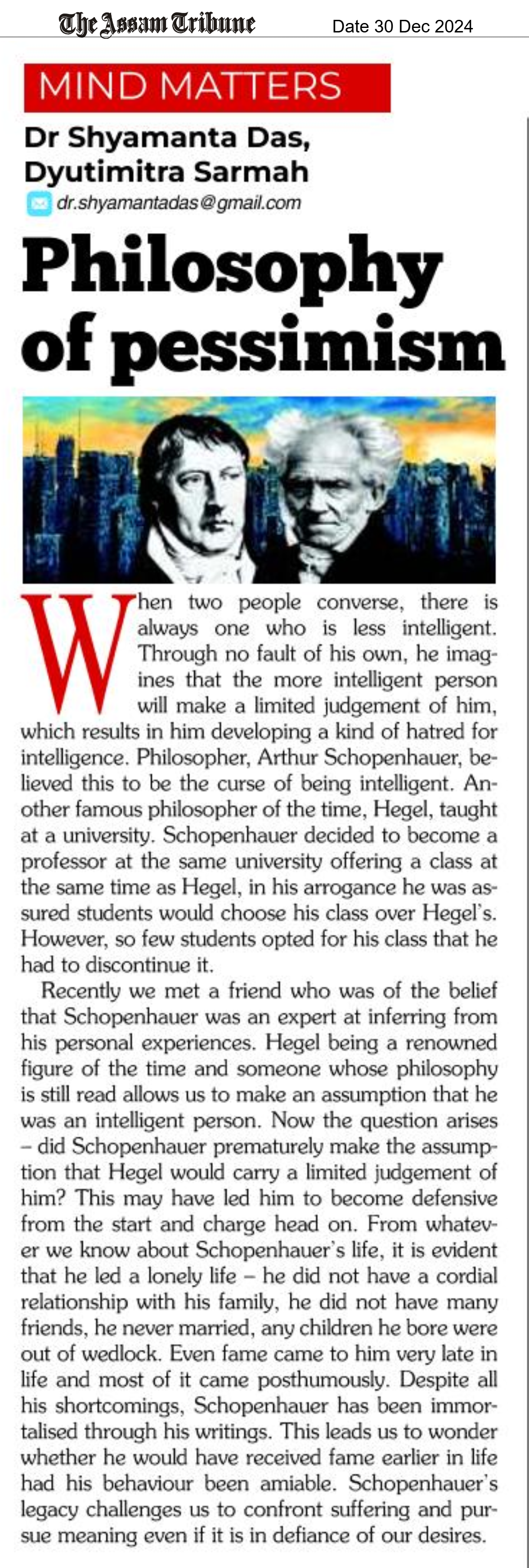 This fortnight’s Mind Matters column in Horizon, the Monday supplement with The Assam Tribune by the Editor-in-Chief of the Open Journal of Psychiatry & Allied Sciences (OJPAS®), Shyamanta Das and Dyutimitra Sarmah is titled, “Philosophy of pessimism.”