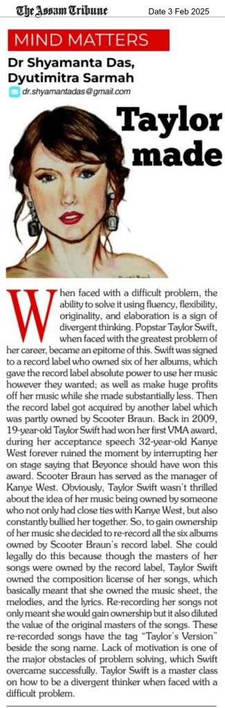 This fortnight’s Mind Matters column in Horizon, the Monday supplement with The Assam Tribune by the Editor-in-Chief of the Open Journal of Psychiatry & Allied Sciences (OJPAS®), Shyamanta Das and Dyutimitra Sarmah is titled, “Taylor made.”