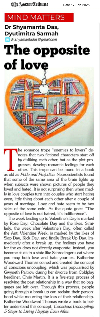 This fortnight’s Mind Matters column in Horizon, the Monday supplement with The Assam Tribune by the Editor-in-Chief of the Open Journal of Psychiatry & Allied Sciences (OJPAS®), Shyamanta Das and Dyutimitra Sarmah is titled, “The opposite of love.”
