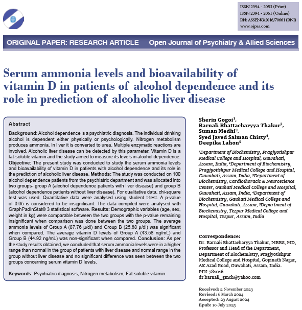 “Serum ammonia levels and bioavailability of vitamin D in patients of alcohol dependence and its role in prediction of alcoholic liver disease” by Sherin Gogoi, Barnali Bhattacharyya Thakur, Suman Medhi, Syed Javed Salman Chisty, and Deepika Lahon is the new Advance Online Publication (AOP) of the Open Journal of Psychiatry & Allied Sciences (OJPAS®).