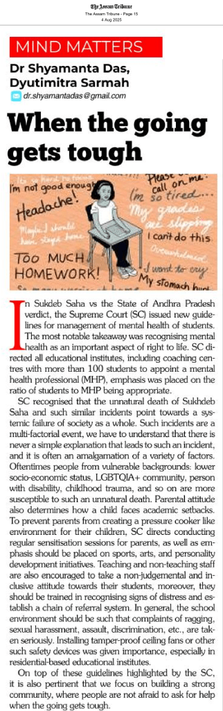 This fortnight’s Mind Matters column in Horizon, the Monday supplement with The Assam Tribune by the Editor-in-Chief of the Open Journal of Psychiatry & Allied Sciences (OJPAS®), Shyamanta Das and Dyutimitra Sarmah is titled, “When the going gets tough.”