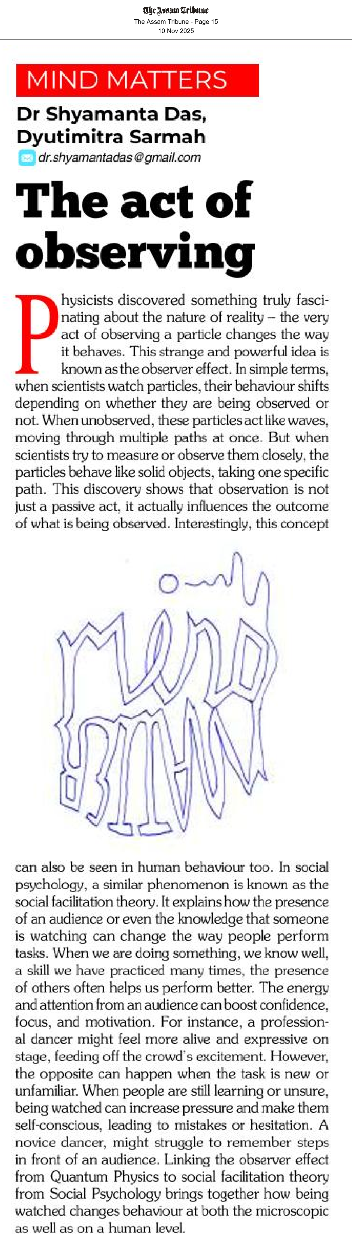 This fortnight’s Mind Matters column in Horizon, the Monday supplement with The Assam Tribune by the Editor-in-Chief of the Open Journal of Psychiatry & Allied Sciences (OJPAS®), Shyamanta Das and Dyutimitra Sarmah is titled, “The act of observing.”