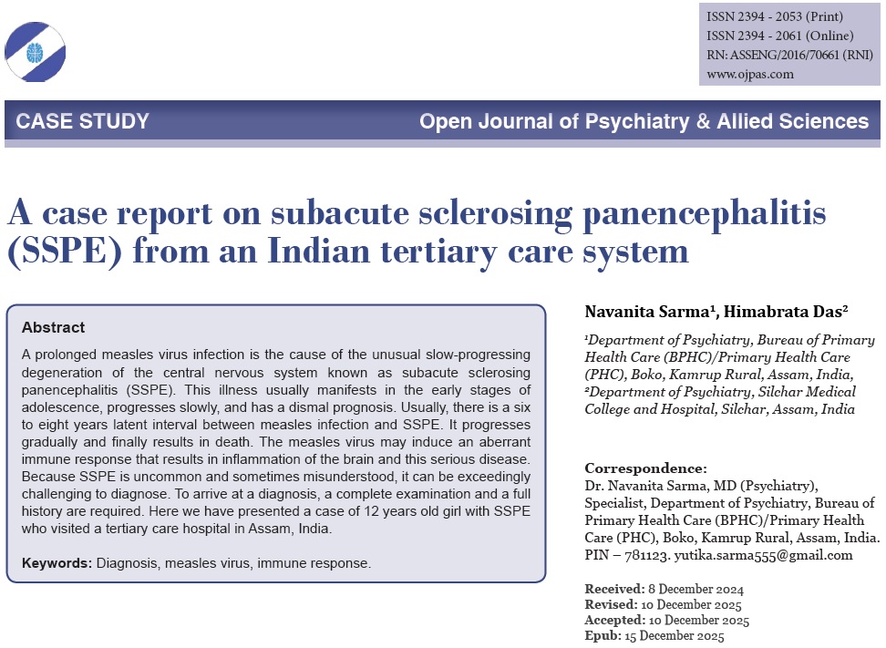 “A case report on subacute sclerosing panencephalitis (SSPE) from an Indian tertiary care system” by Navanita Sarma and Himabrata Das is the new Advance Online Publication (AOP) of the Open Journal of Psychiatry & Allied Sciences (OJPAS®).