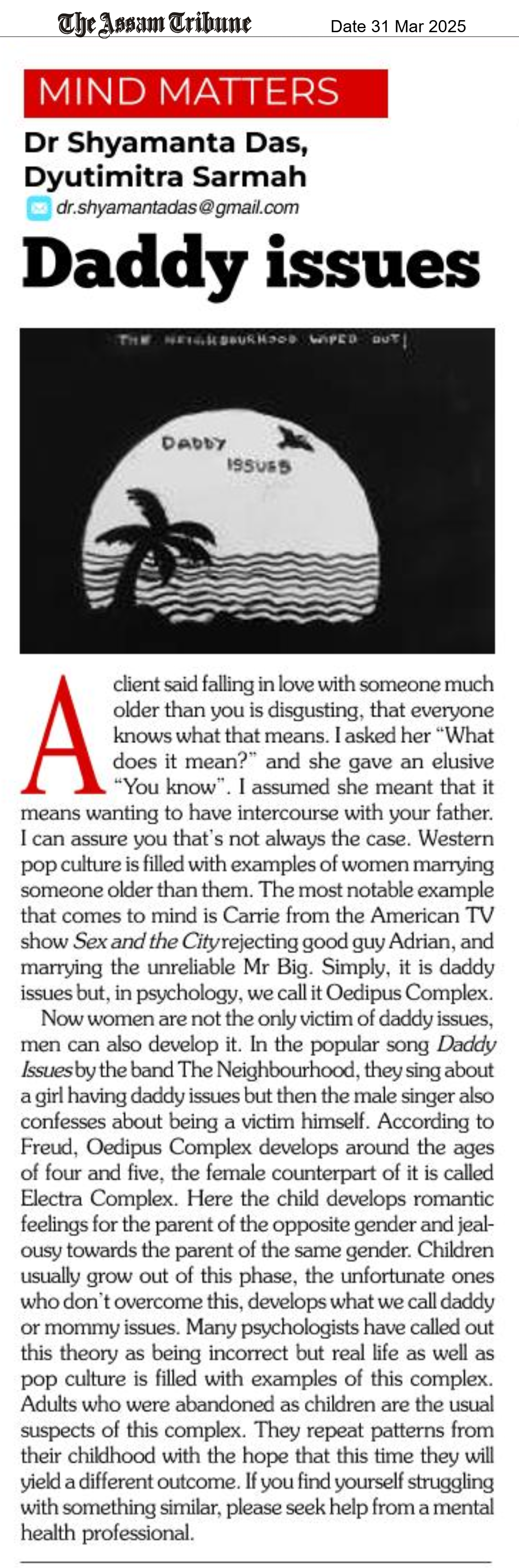This fortnight’s Mind Matters column in Horizon, the Monday supplement with The Assam Tribune by the Editor-in-Chief of the Open Journal of Psychiatry & Allied Sciences (OJPAS®), Shyamanta Das and Dyutimitra Sarmah is titled, “Daddy issues.”