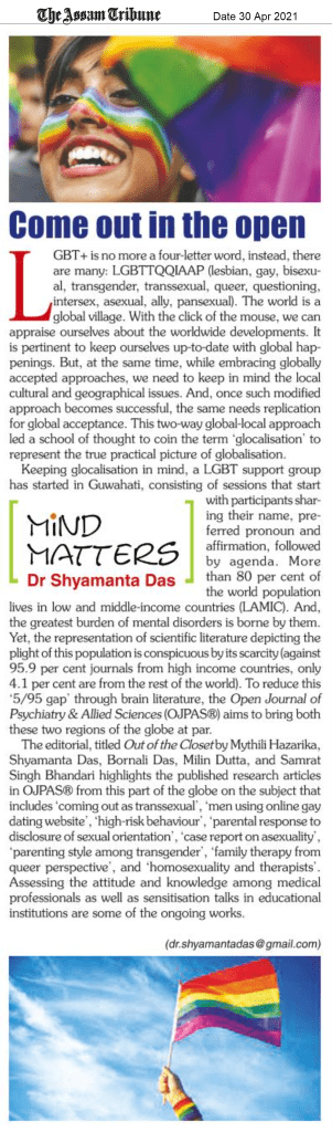 Titled “Coming out in the open”, this fortnight’s Mind Matters column of the Editor-in-Chief of the Open Journal of Psychiatry & Allied Sciences (OJPAS®), Shyamanta Das in Horizon, the Friday supplement with The Assam Tribune highlights the Editorial, “Out of the closet” by Mythili Hazarika, Shyamanta Das, Bornali Das, Milin Dutta, and Samrat Singh Bhandari, and published in the July-December 2020, Volume 11 Issue 2 of OJPAS®.
