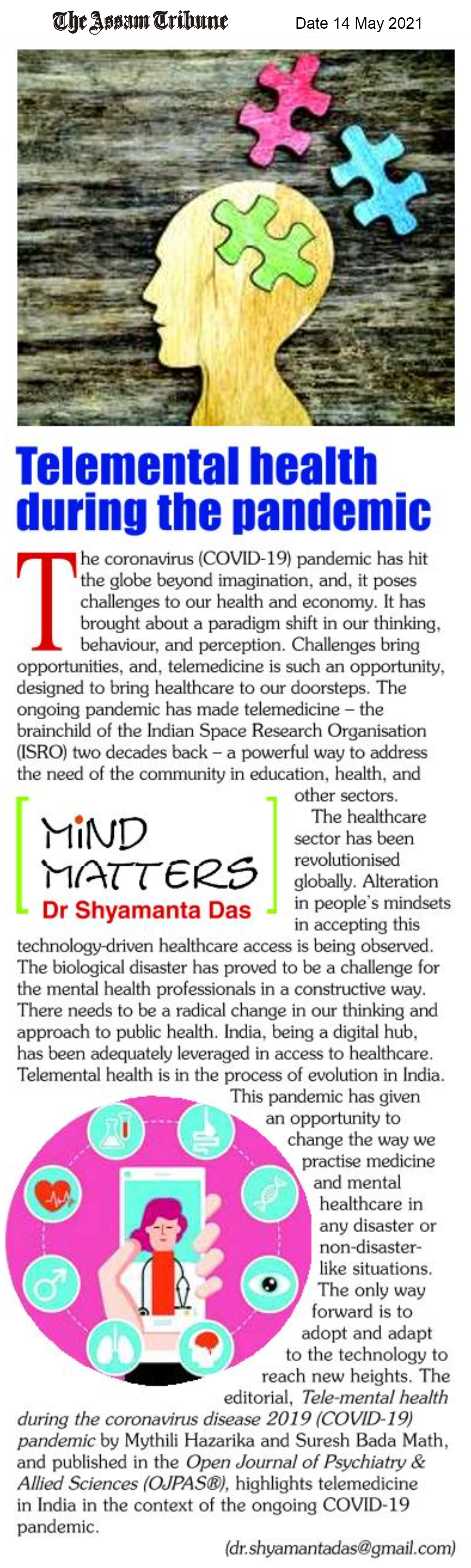 The Editor-in-Chief of the Open Journal of Psychiatry & Allied Sciences (OJPAS®), Shyamanta Das in this fortnight’s Mind Matters column, titled “Telemental health during the pandemic” in Horizon, the Friday supplement with The Assam Tribune highlights the editorial, ‘Tele-mental health during the coronavirus disease 2019 (COVID-19) pandemic’ by Mythili Hazarika and Suresh Bada Math, and published in the July-December 2020, Volume 11 Issue 2 of OJPAS®.