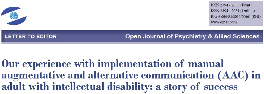 “Our experience with implementation of manual augmentative and alternative communication (AAC) in adult with intellectual disability: a story of success” by Himanshu Verma, Harisha Madishetty, and Gourishanker Patil is the new Advance Online Publication of the Open Journal of Psychiatry & Allied Sciences (OJPAS®).