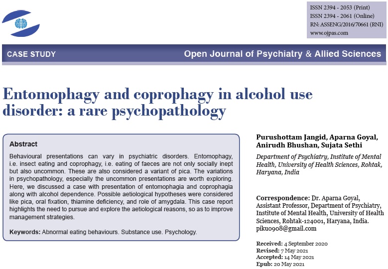 “Entomophagy and coprophagy in alcohol use disorder: a rare psychopathology” by Purushottam Jangid, Aparna Goyal, Anirudh Bhushan, and Sujata Sethi is the new Advance Online Publication of the Open Journal of Psychiatry & Allied Sciences (OJPAS®).
