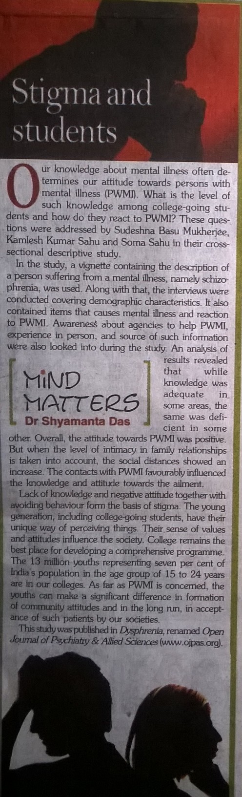 In Horizon, the supplement of The Assam Tribune, dated Friday 27 May 2016, Shyamanta Das, the Editor-in-Chief of the Open Journal of Psychiatry & Allied Sciences (OJPAS), in his Mind Matters column, titled “Stigma and students”, wrote about the research, “Stigma: knowledge of college going students about mental illness and reaction towards the persons with mental llness” by Sudeshna Basu Mukherjee, Kamlesh Kumar Sahu, and Soma Sahu that was published in Dysphrenia (July-December 2014, Volume 5 Issue 2), renamed Open Journal of Psychiatry & Allied Sciences (OJPAS).